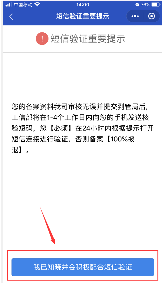 温馨提示:提交备案成功后,一定要注意回复短信验证,一般来说3-5个工作日,管局会发送短信到法人手机上,短信核验请看教程: