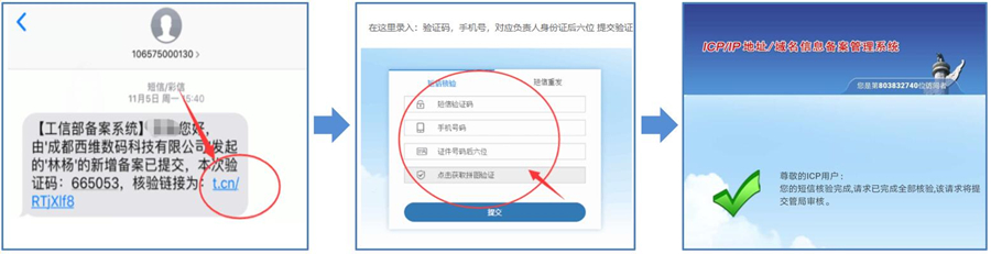备案短信验证:审核期间,工信部备案系统会向企业法人和网站负责人的手机,发送短信验证码。企业法人和网站负责人两人,需要分别在手机上,根据短信提示操作并验证后,才能通过。