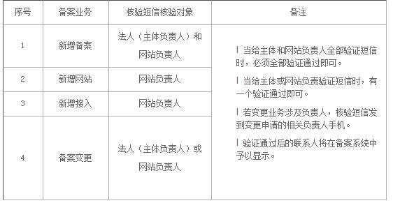 1:用户提交的备案类型是首次新增备案时,主体负责人(法人)及网站负责人手机号验证码均需验证。